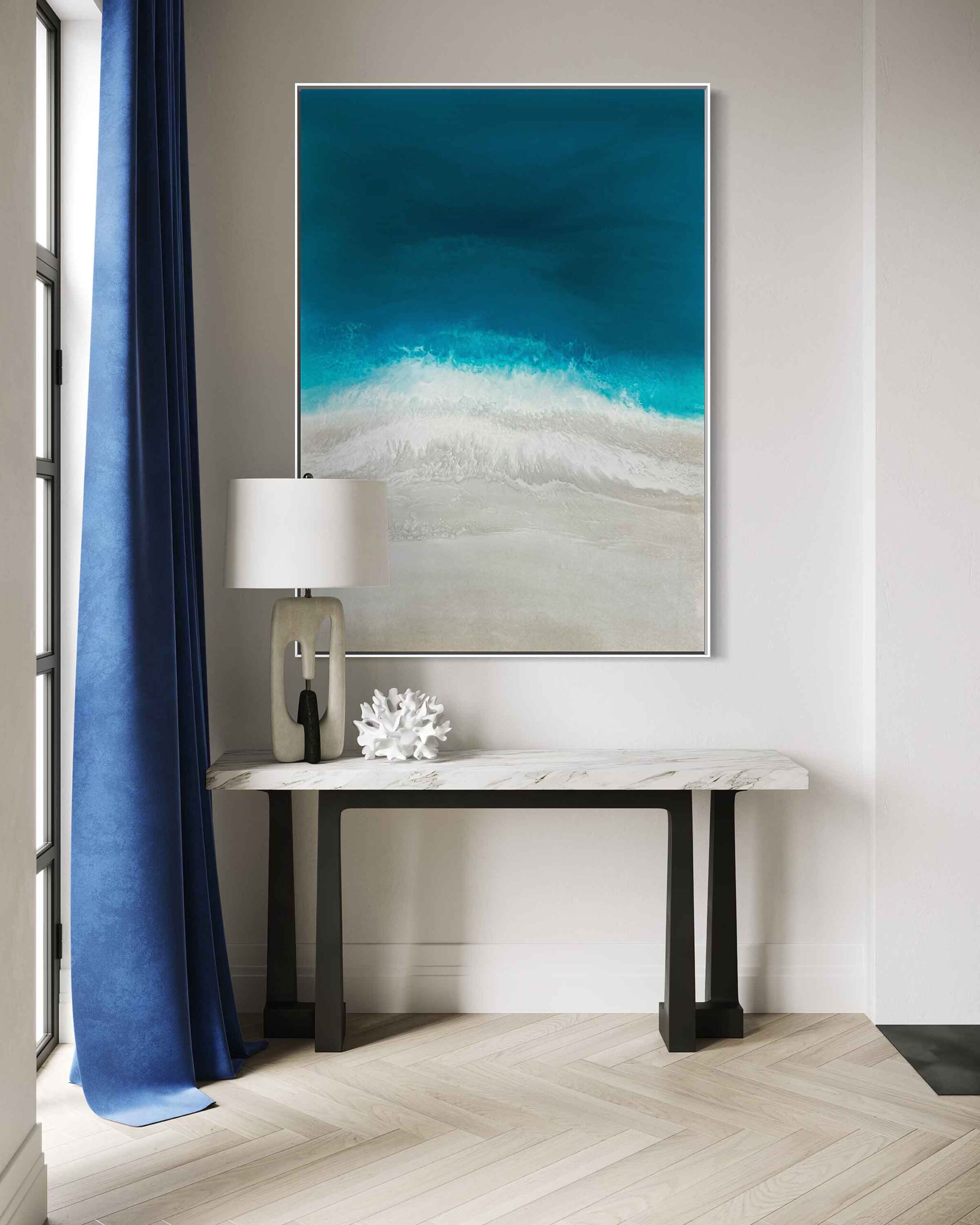 Simply send us a front on photo (jpeg or PDF) of your wall space then tell us which artwork you’re considering and the size. We will then super impose the artwork onto your wall, allowing you to be totally sure that the artwork you’ve chosen is just right for your space.