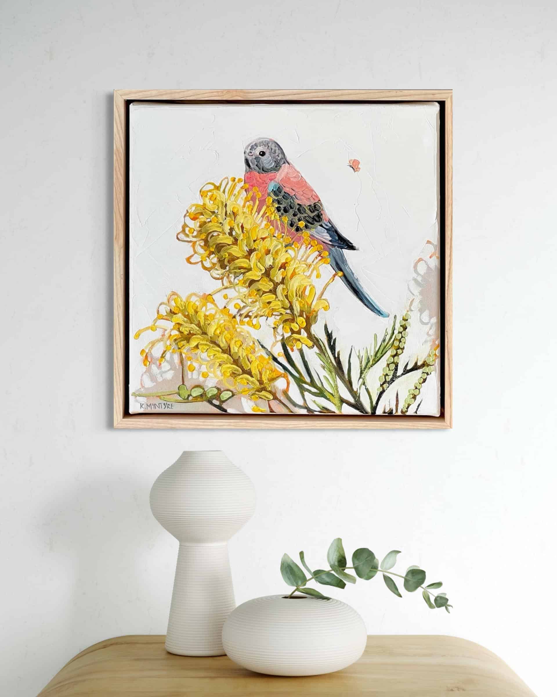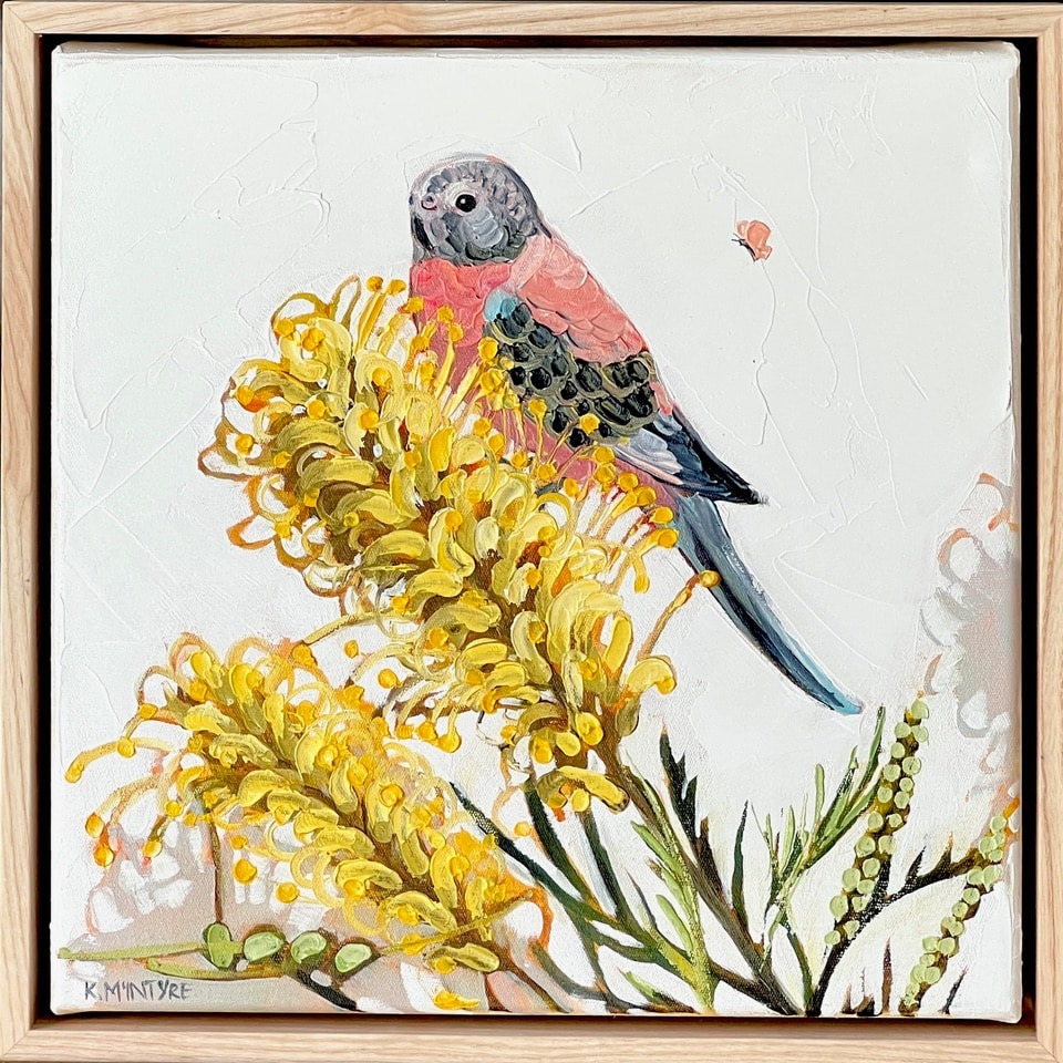 Bourke’s parrot with moonlight grevilea – Kirsty McIntyre