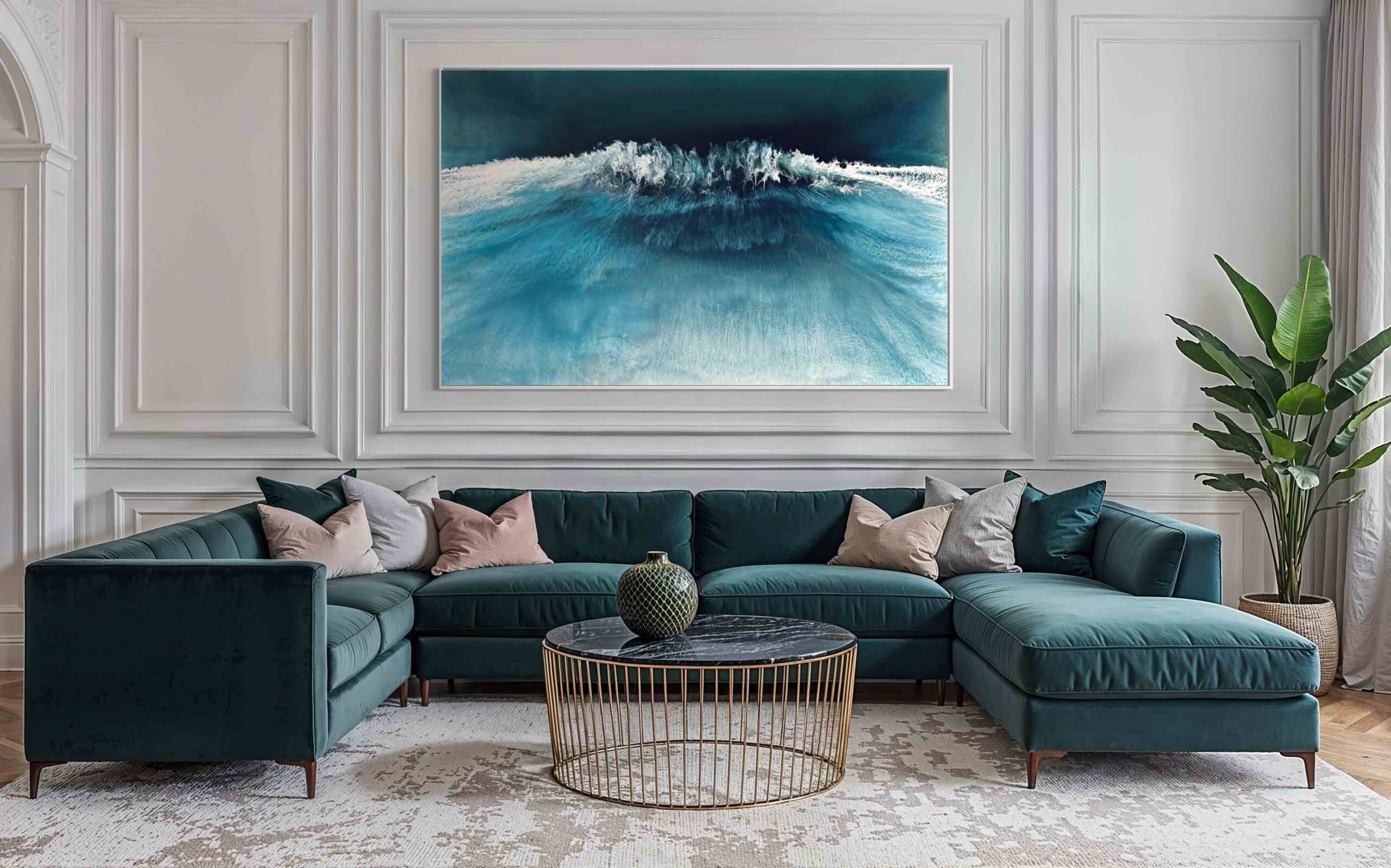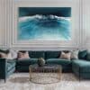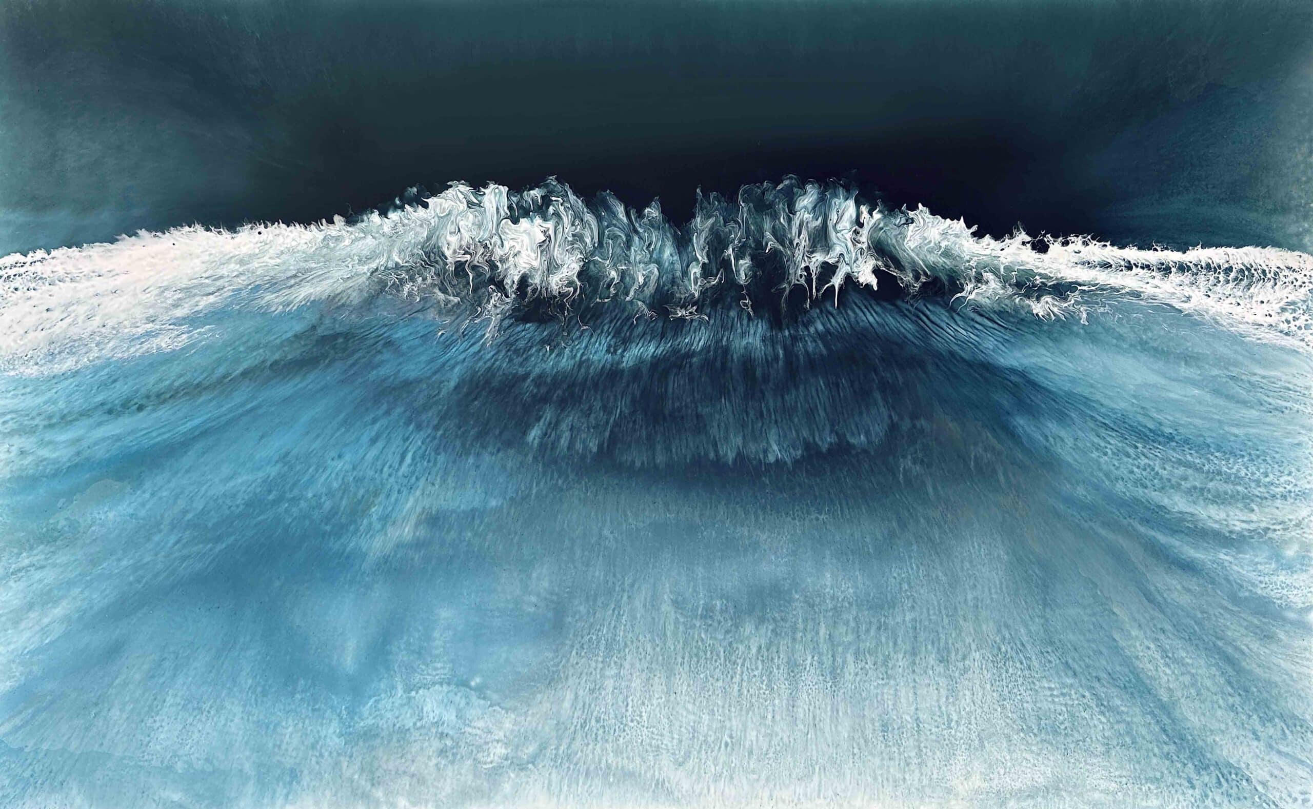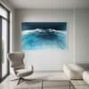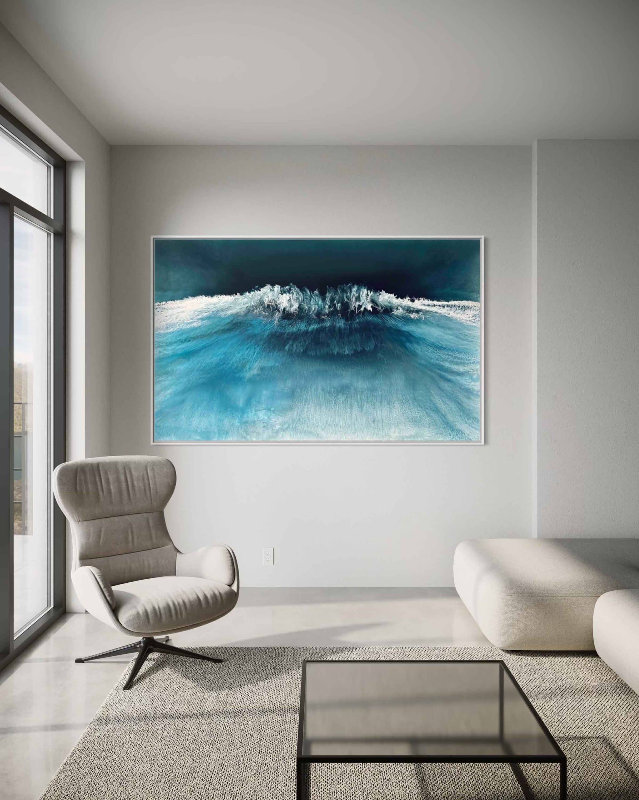 In this painting, I ventured to blend realism with a touch of surrealism, using resin and pigments to capture the mysterious depths and dynamic surface of the sea. The colors and textures create a dreamlike vision of the ocean’s power and tranquility. The artwork is meant to evoke the awe one feels when faced with the vast, untamable natural world, providing a daily reminder of nature’s dual nature of calm and chaos. The piece comes alive in any space, adding a serene yet invigorating energy to your home.
