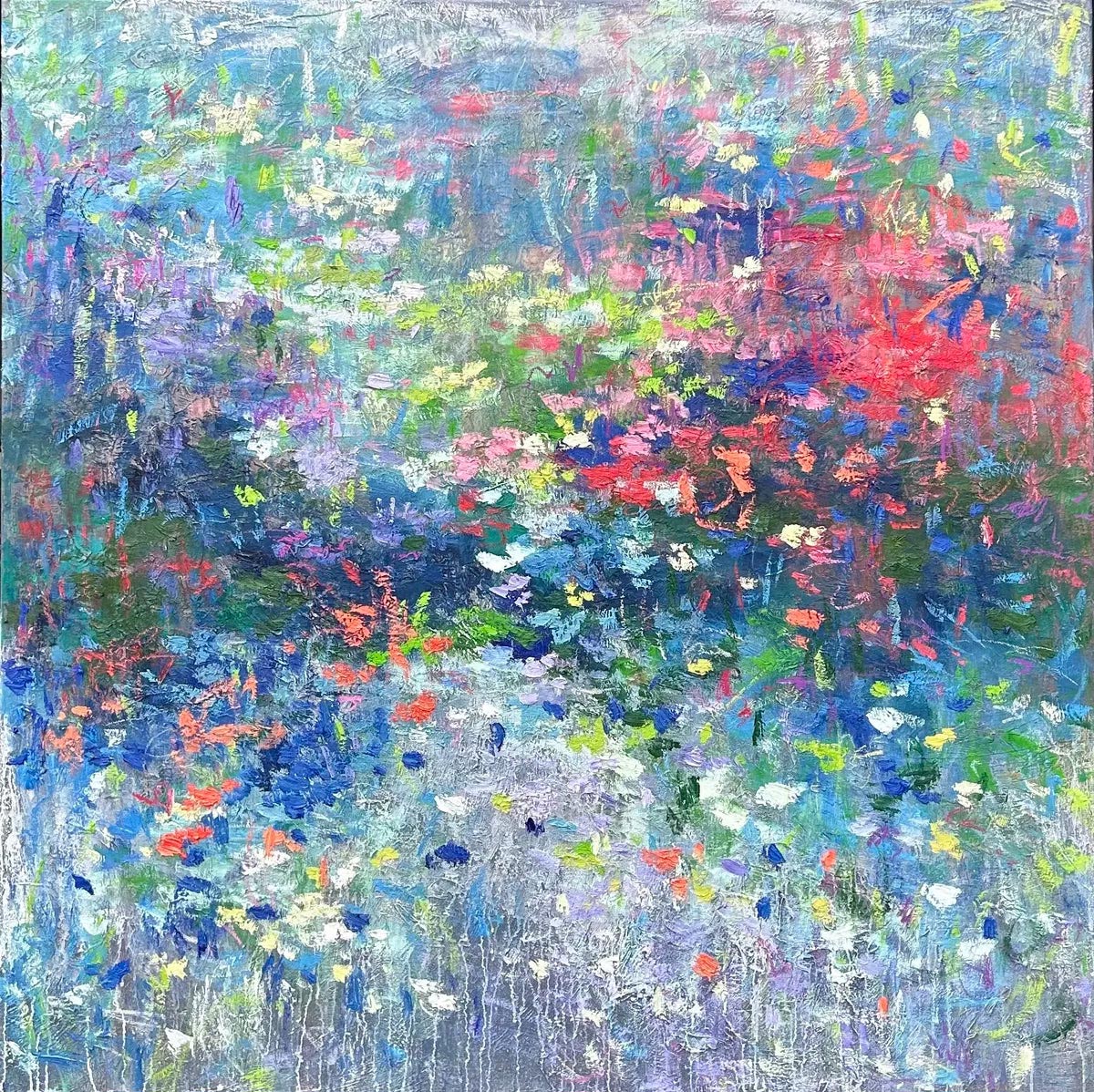 The artist paints intuitively without preconception, each work reading like a painterly stream of consciousness, a reflection upon her inner world and the evocative tones of the Australian landscape. Her paintings capture a fleeting moment in time, portraying the mood and the inspiration of that particular moment of inspiration. The artworks come together spontaneously in a colourful union of light, colour and texture.