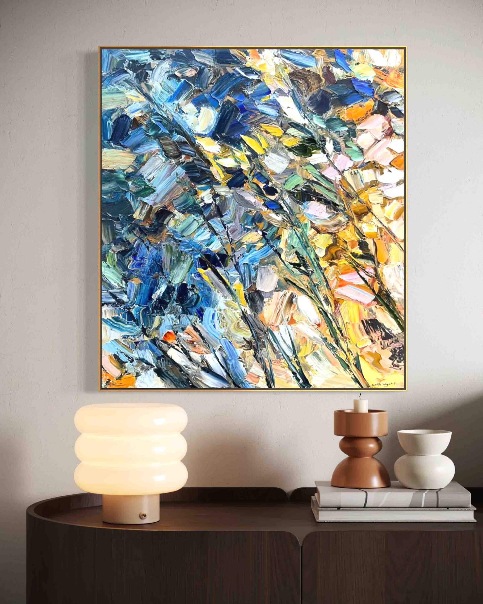 She explores form and line using texture, allowing shapes to evolve from the thick and generous application of impasto and paint. The light is reflected and emphasised from the sculptural effects created by the textured finish. The final stage of varnishing evens out the surface and increases the colour saturation of the work.