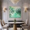 Working with oil paint, charcoal, spray paint and oil crayons, she captures a spectrum of moods – from quiet, melancholy moments of indigo and teal to swathes of Persian pink and saffron. The viewer can choose where they sit in this vast spectrum of emotion; whether they gravitate towards the darkness or the light.
