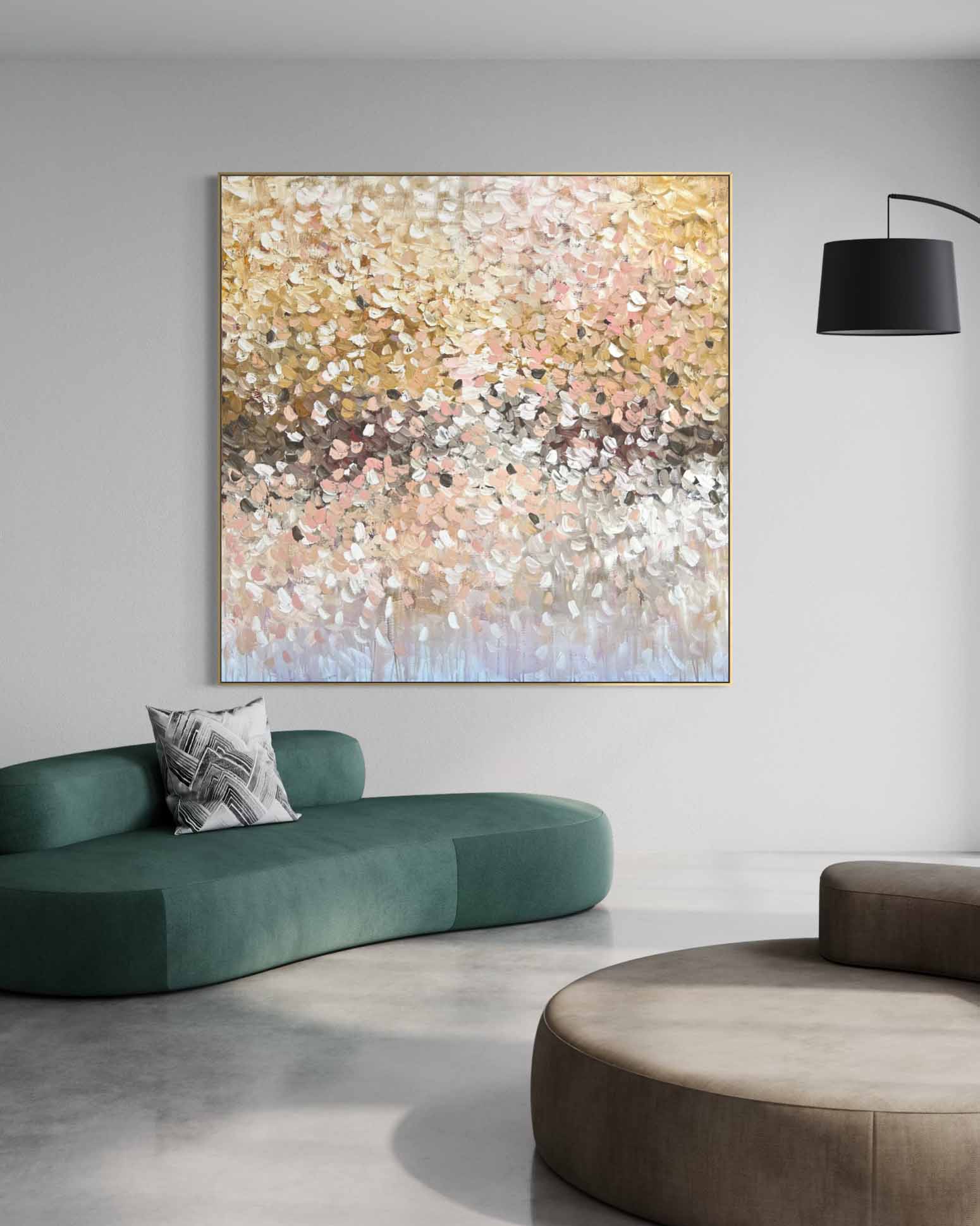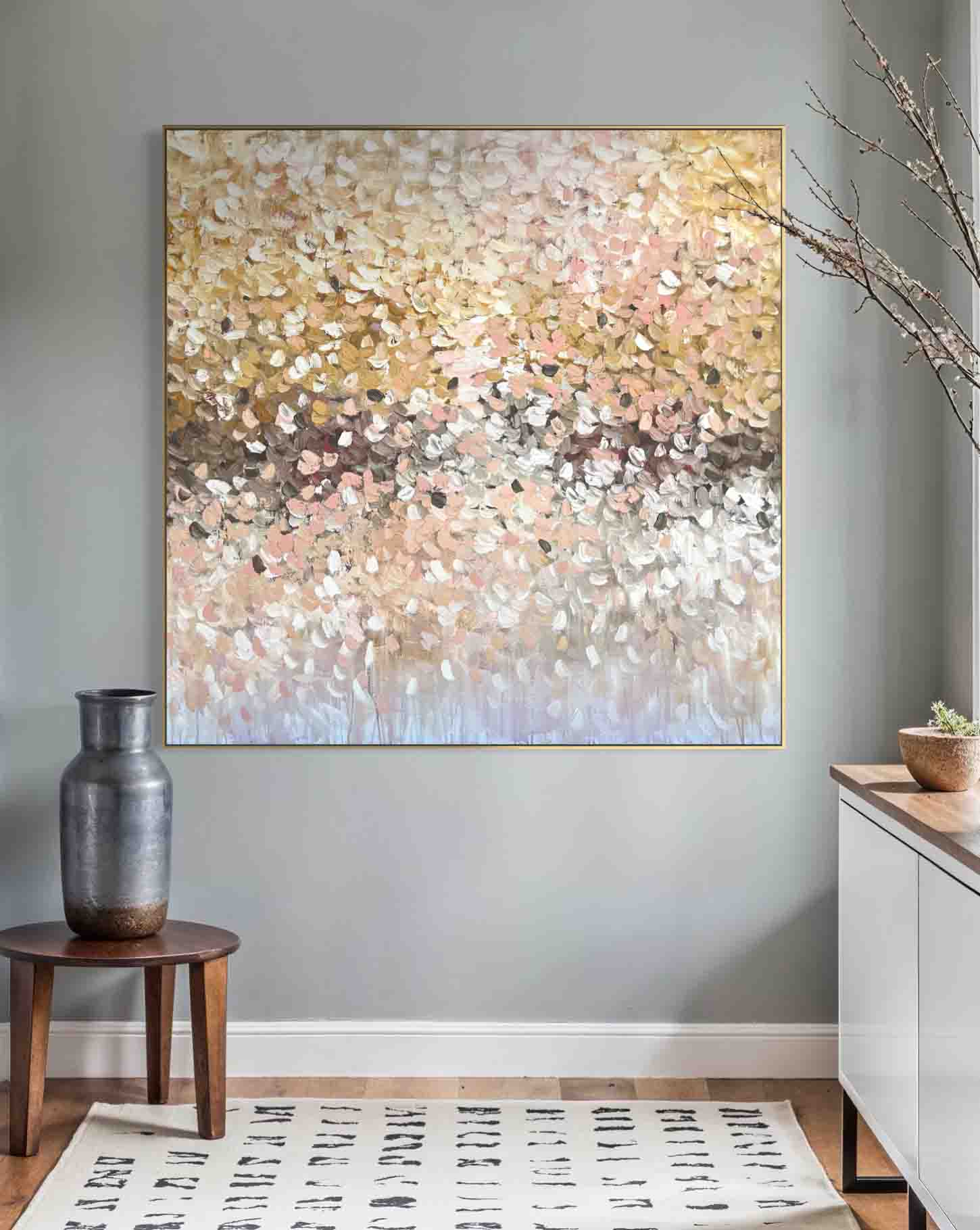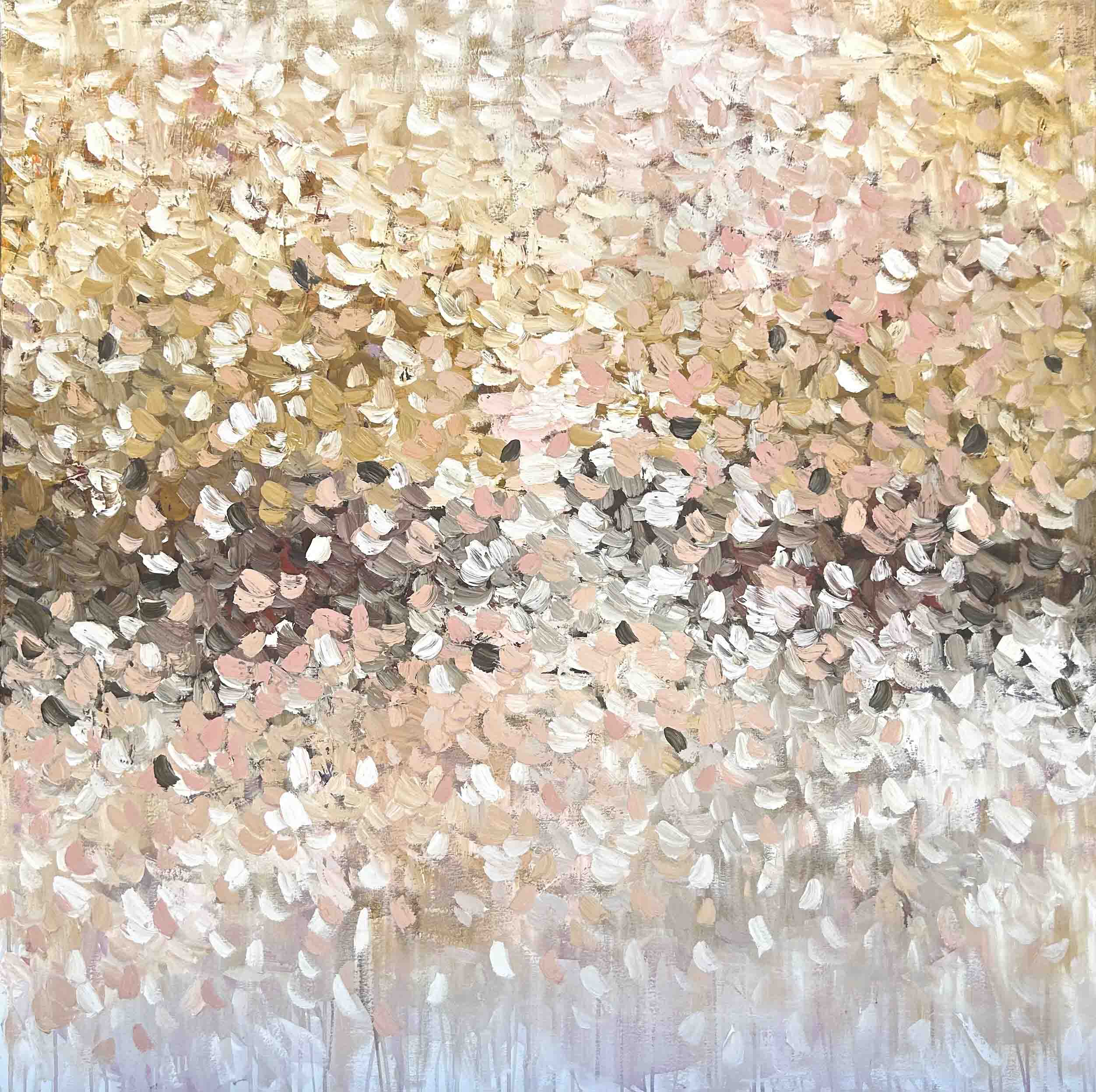 ‘Wild at Heart’ is an expressive abstract oil painting featuring soft, layered brushstrokes in earthy tones of brown, beige, and blush pink, with hints of blue. The composition suggests organic movement, reminiscent of wildflowers or leaves scattered by the wind. The delicate drips of paint at the bottom evoke a sense of fluidity and freedom, aligning with the artwork’s untamed and emotional essence.