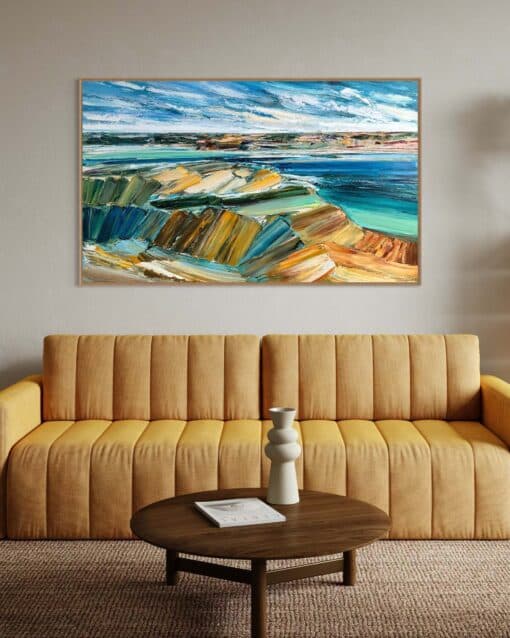 Simply send us a front on photo (jpeg or PDF) of your wall space then tell us which artwork you’re considering and the size. We will then super impose the artwork onto your wall, allowing you to be totally sure that the artwork you’ve chosen is just right for your space.