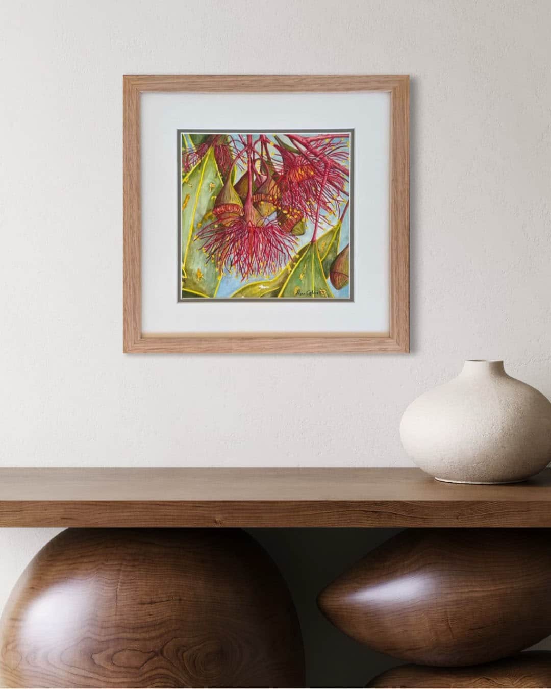 Suzie’s work centres on the intimate details of the landscape – subtle shifts of light, the structure of petals and leaves, the heat and scent of eucalypts, and the moments of quiet presence often overlooked in daily life. Through watercolour, gouache, and photographic study, she examines how colour, texture, and form can evoke memory and renewed attention. Her process begins with direct encounter: noticing how sunlight falls across blossoms, how colour changes throughout the day, or how a plant holds its shape in stillnes