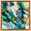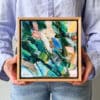 She explores form and line using texture, allowing shapes to evolve from the thick and generous application of impasto and paint. The light is reflected and emphasised from the sculptural effects created by the textured finish. The final stage of varnishing evens out the surface and increases the colour saturation of the work.