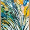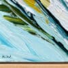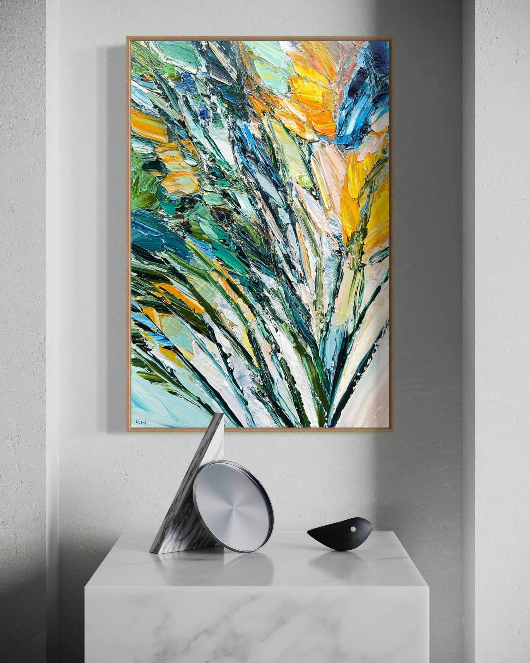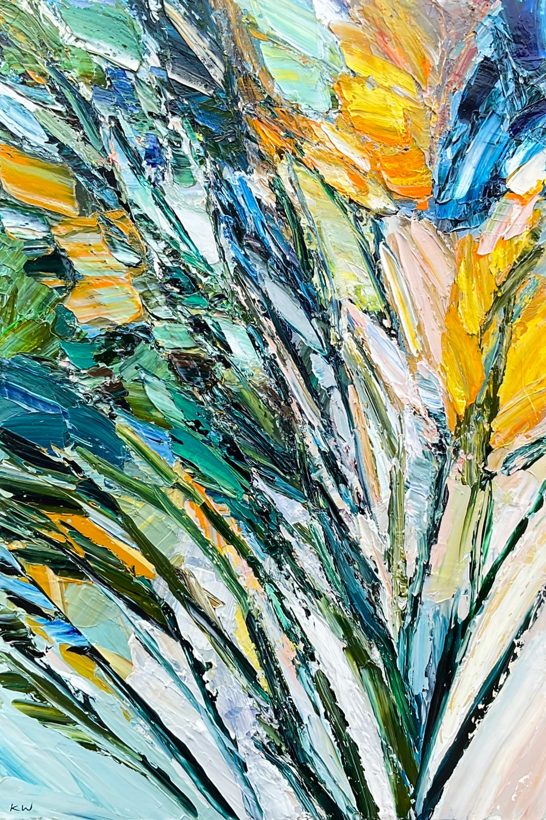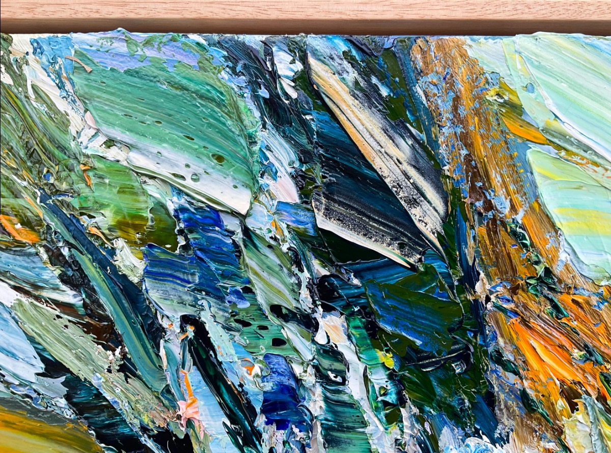 She explores form and line using texture, allowing shapes to evolve from the thick and generous application of impasto and paint. The light is reflected and emphasised from the sculptural effects created by the textured finish. The final stage of varnishing evens out the surface and increases the colour saturation of the work.