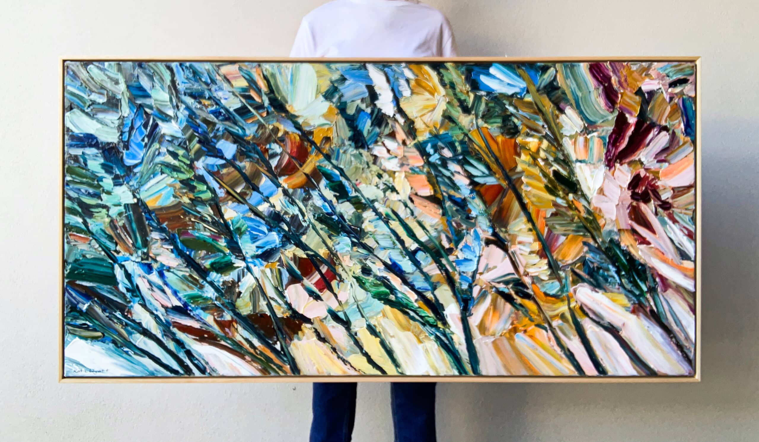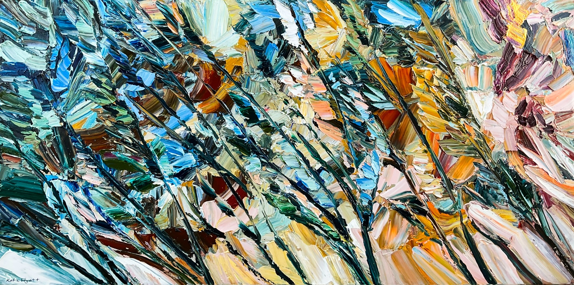 Born in 1974, Katie Wyatt, paints large format impressionist pieces that are heavily textured, impasto works based on her own experiences, memories, photographs and recollections. Katie’s graphic design background is also evident through her solid compositions and strong colour contrasts.