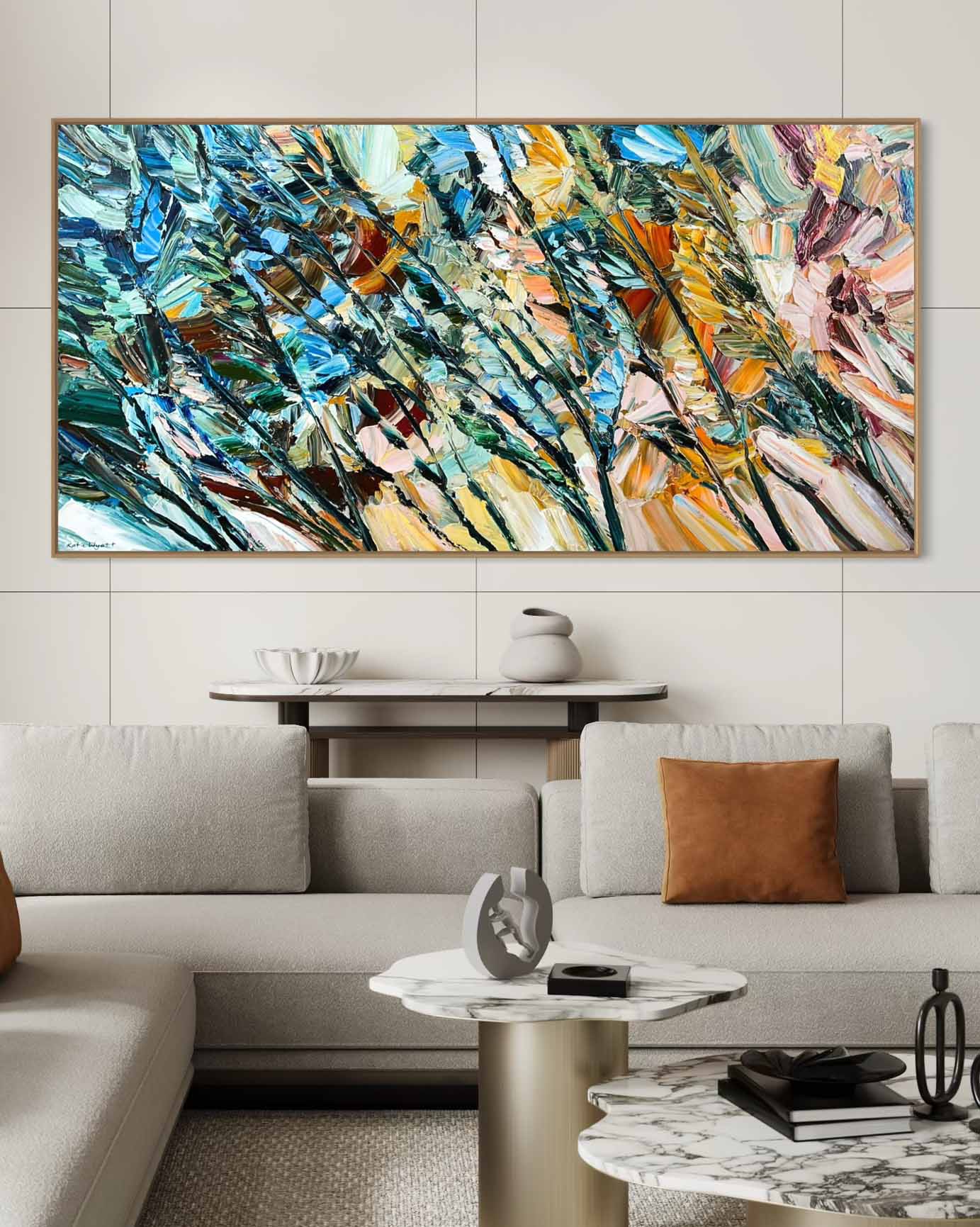 Simply send us a front on photo (jpeg or PDF) of your wall space then tell us which artwork you’re considering and the size. We will then super impose the artwork onto your wall, allowing you to be totally sure that the artwork you’ve chosen is just right for your space.
