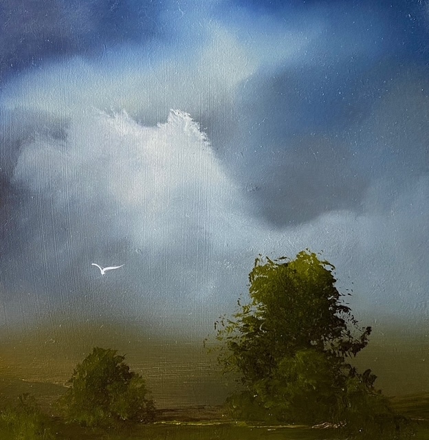 I am also referring to all types of atmospheric optical phenomena and philosophic modal illusions, as well as the illusions that can be conveyed on canvas by painterly effects. Inspired by Turner and the Romantics, I aspire to convey the experience of being immersed in the landscape rather than making a realistic representation of it. Creations born of experience and memory of place, my works begin as abstractions; manipulating oil paint, exploring spaces that exist only on the canvas, blurring and rubbing back, adding, and reducing until eventually a narrative is revealed. Like memories indistinct, they generate an atmospheric poetry, if only momentarily.