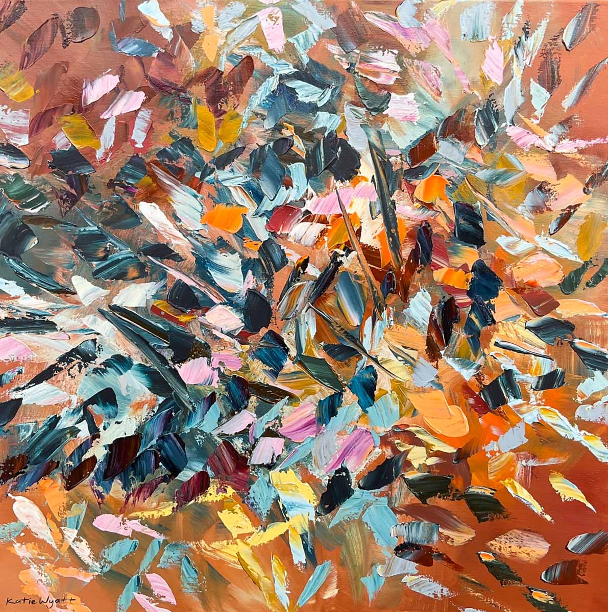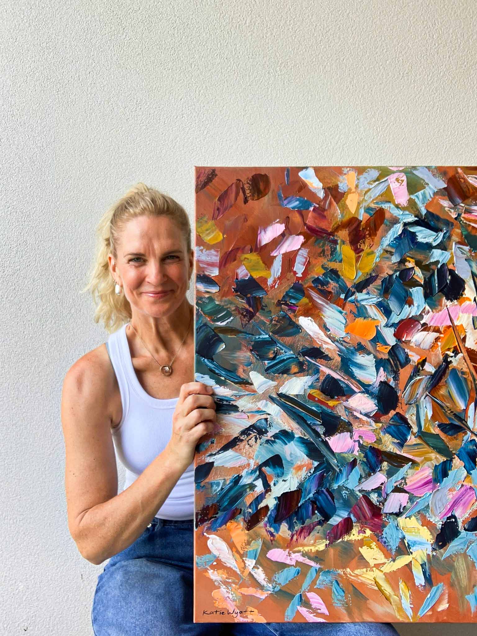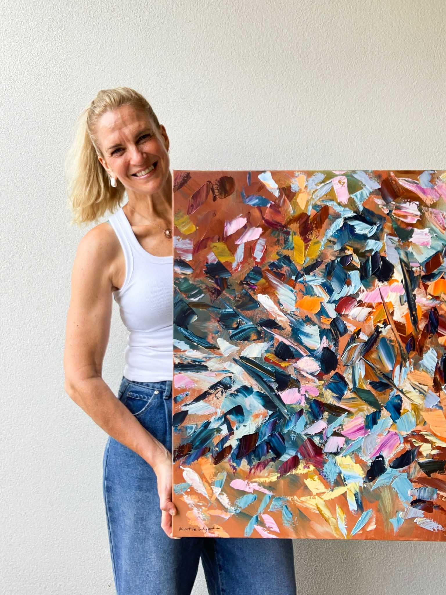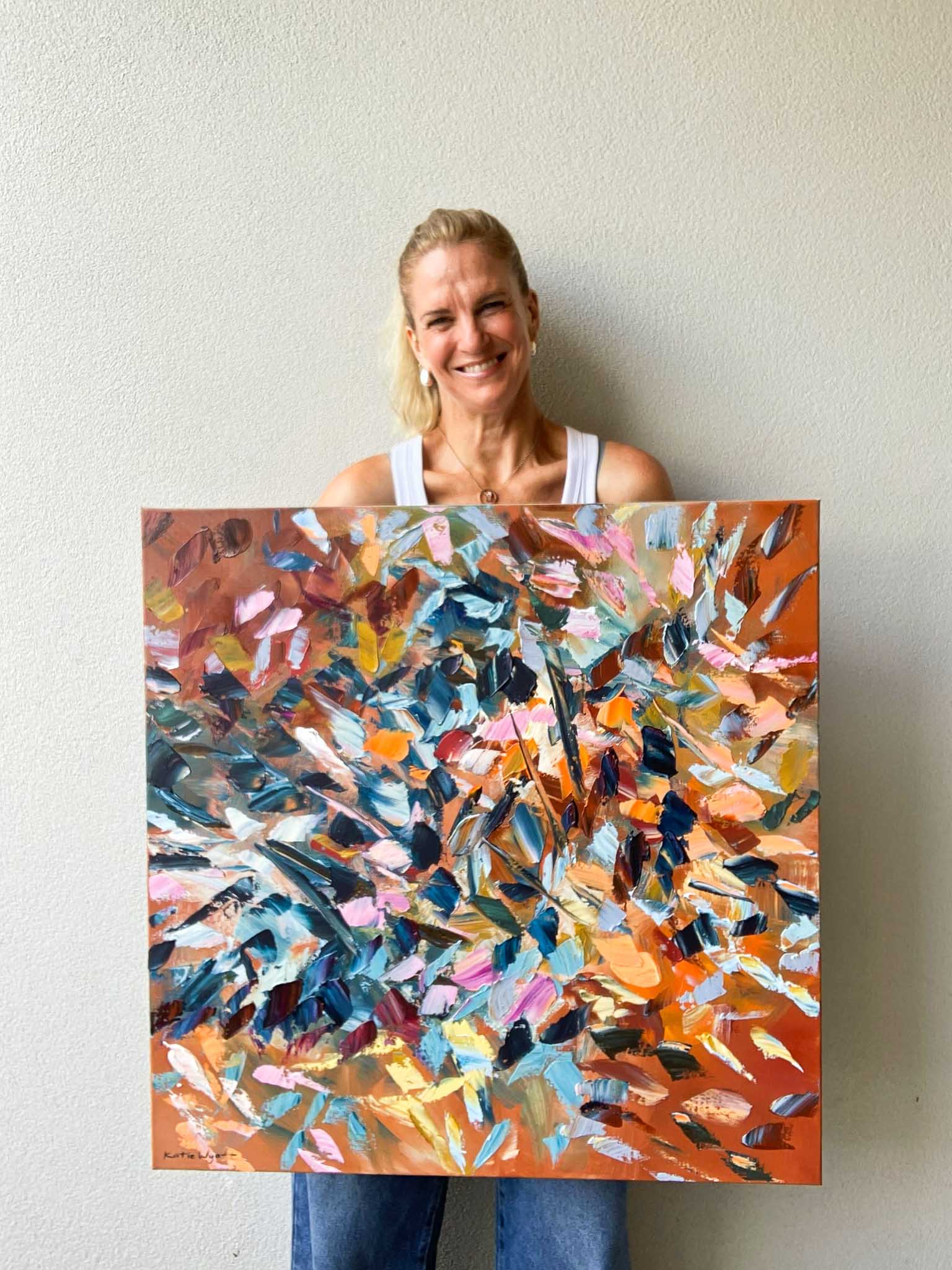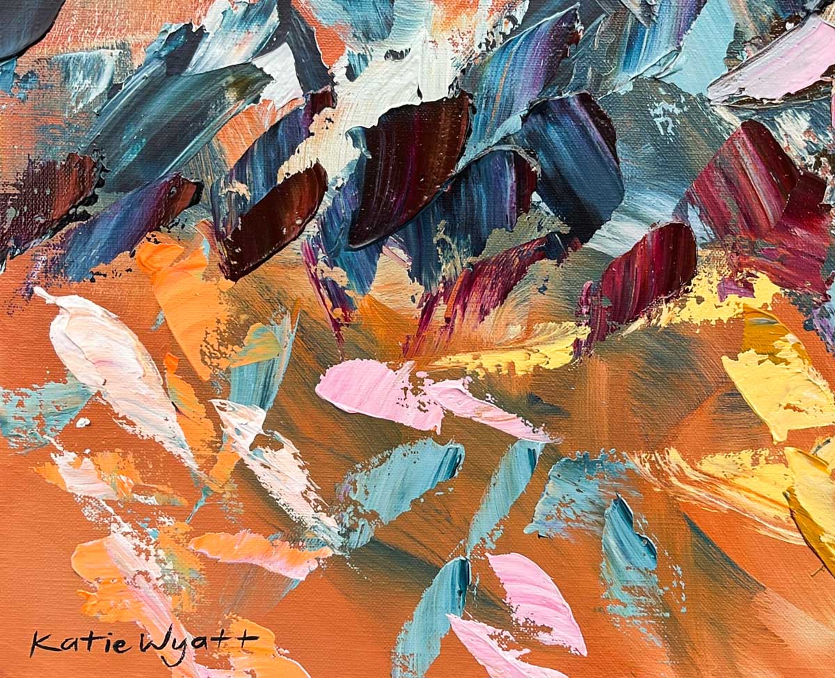 Born in 1974, Katie Wyatt, paints large format impressionist pieces that are heavily textured, impasto works based on her own experiences, memories, photographs and recollections. Katie’s graphic design background is also evident through her solid compositions and strong colour contrasts.