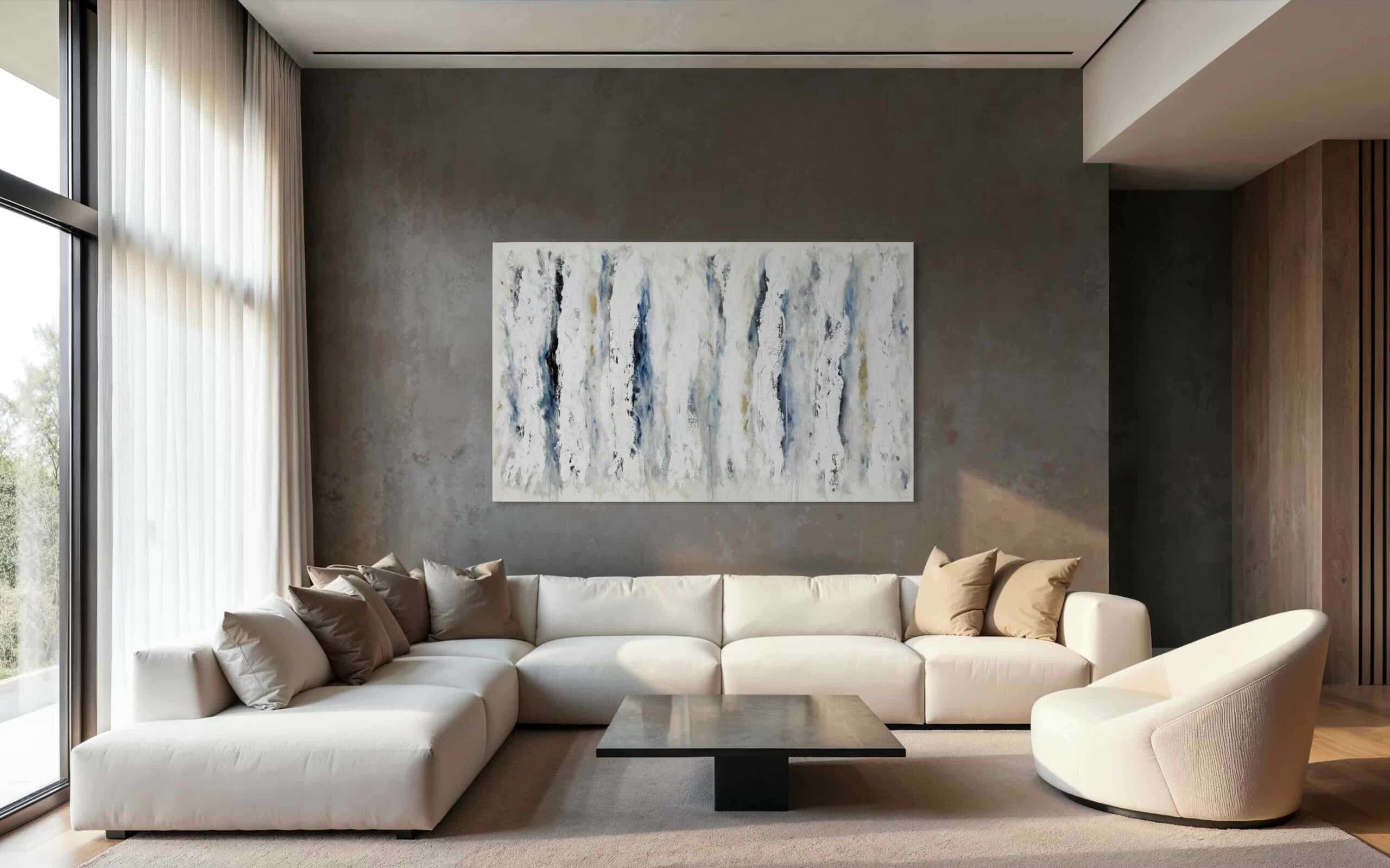 In addition to brushes, I like to experiment with anything that makes an interesting mark, such as sticks and feathers, and I love to use my hands, connecting directly with the canvas. My colour palette is strongly influenced by my Scandinavian background: charcoal, black, raw umber, grey and white often feature.
