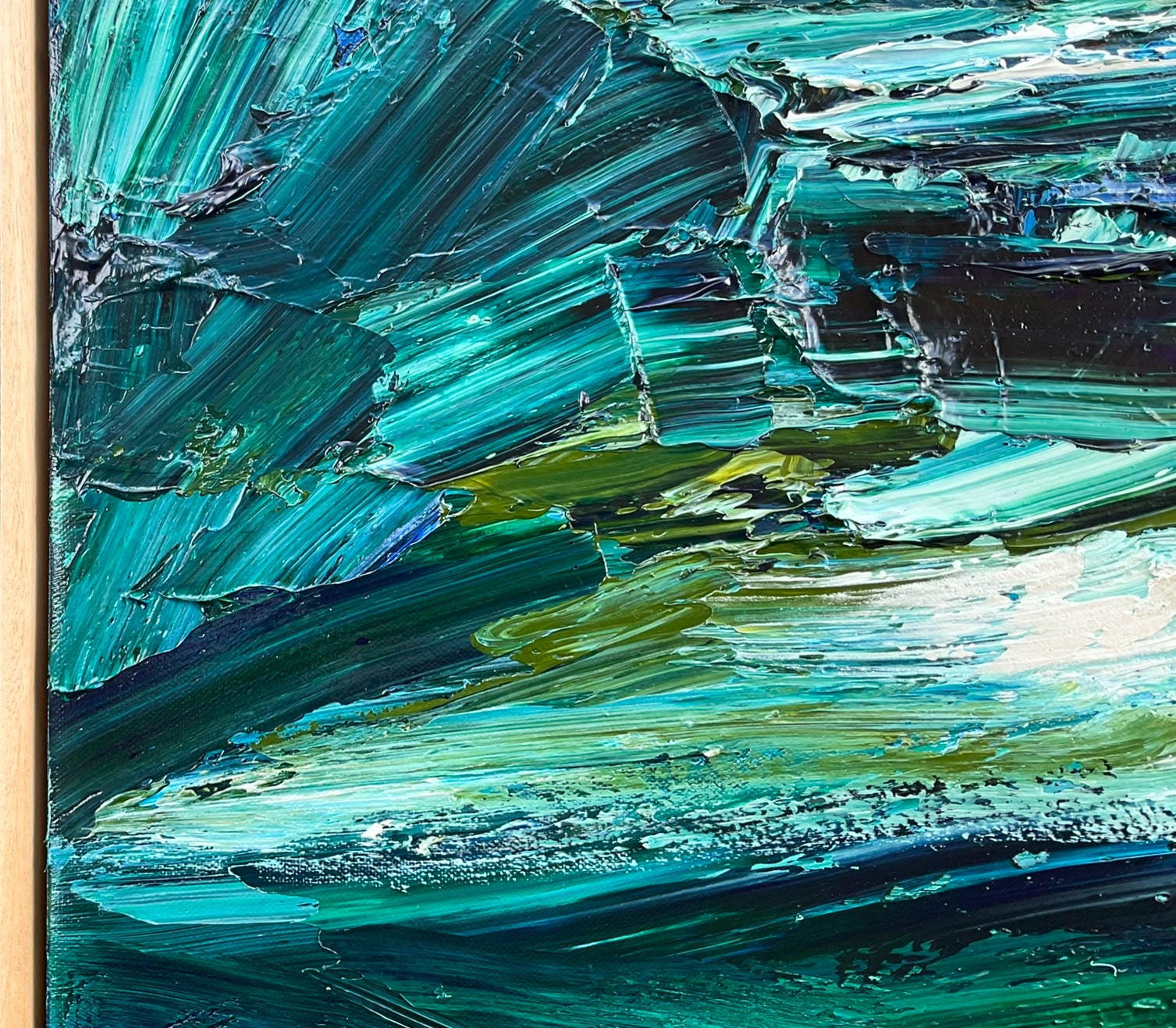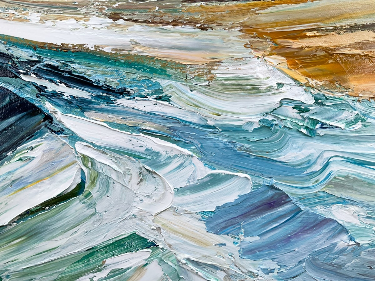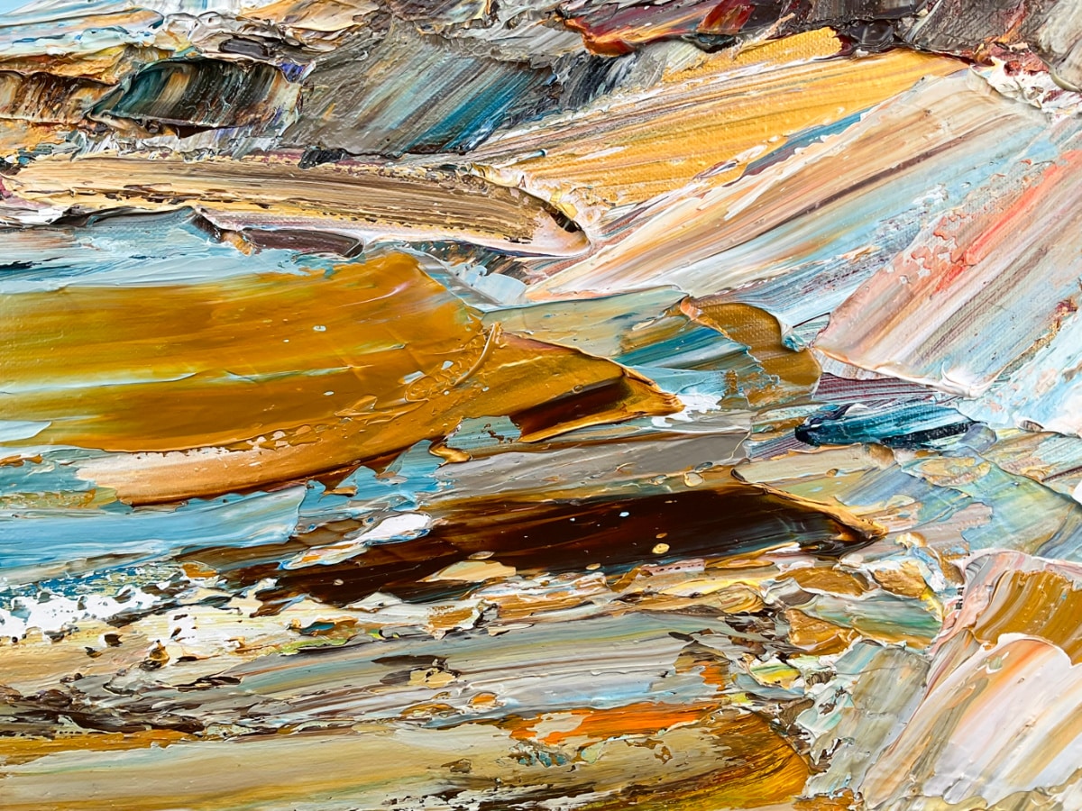 She explores form and line using texture, allowing shapes to evolve from the thick and generous application of impasto and paint. The light is reflected and emphasised from the sculptural effects created by the textured finish. The final stage of varnishing evens out the surface and increases the colour saturation of the work.