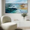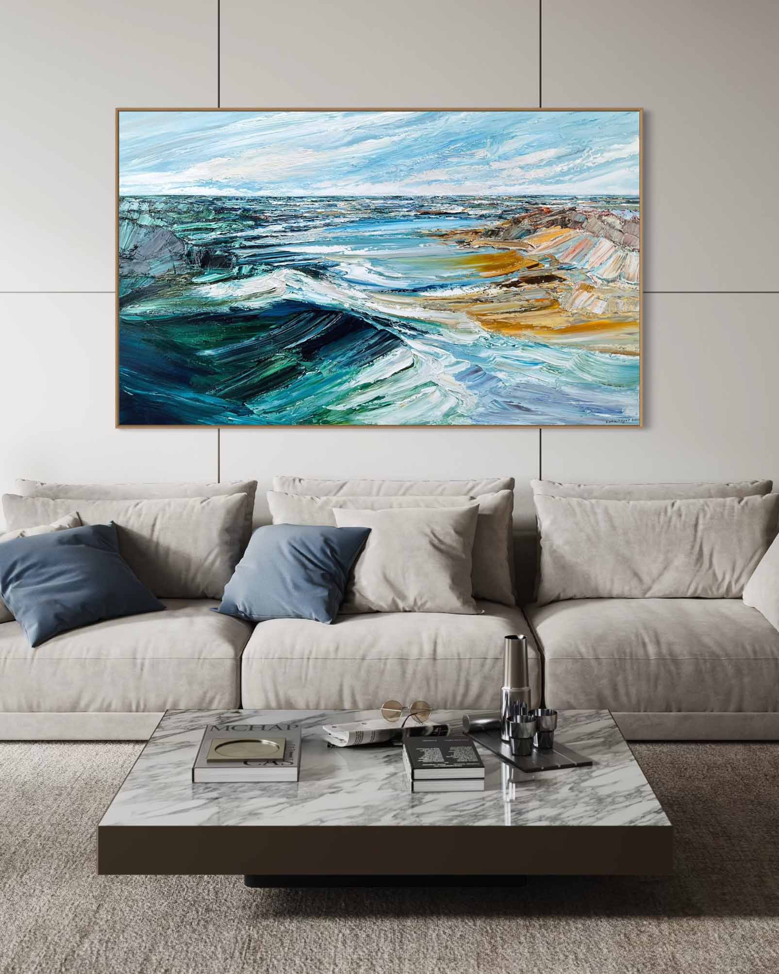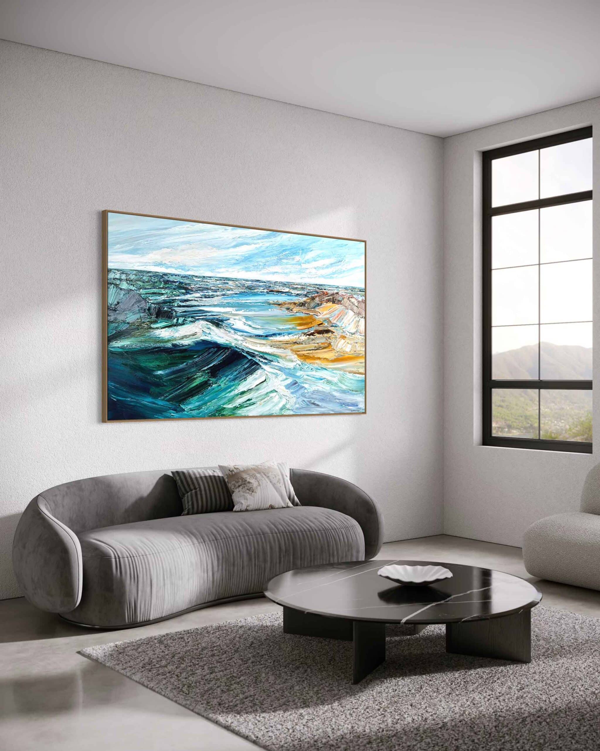 Simply send us a front on photo (jpeg or PDF) of your wall space then tell us which artwork you’re considering and the size. We will then super impose the artwork onto your wall, allowing you to be totally sure that the artwork you’ve chosen is just right for your space.
