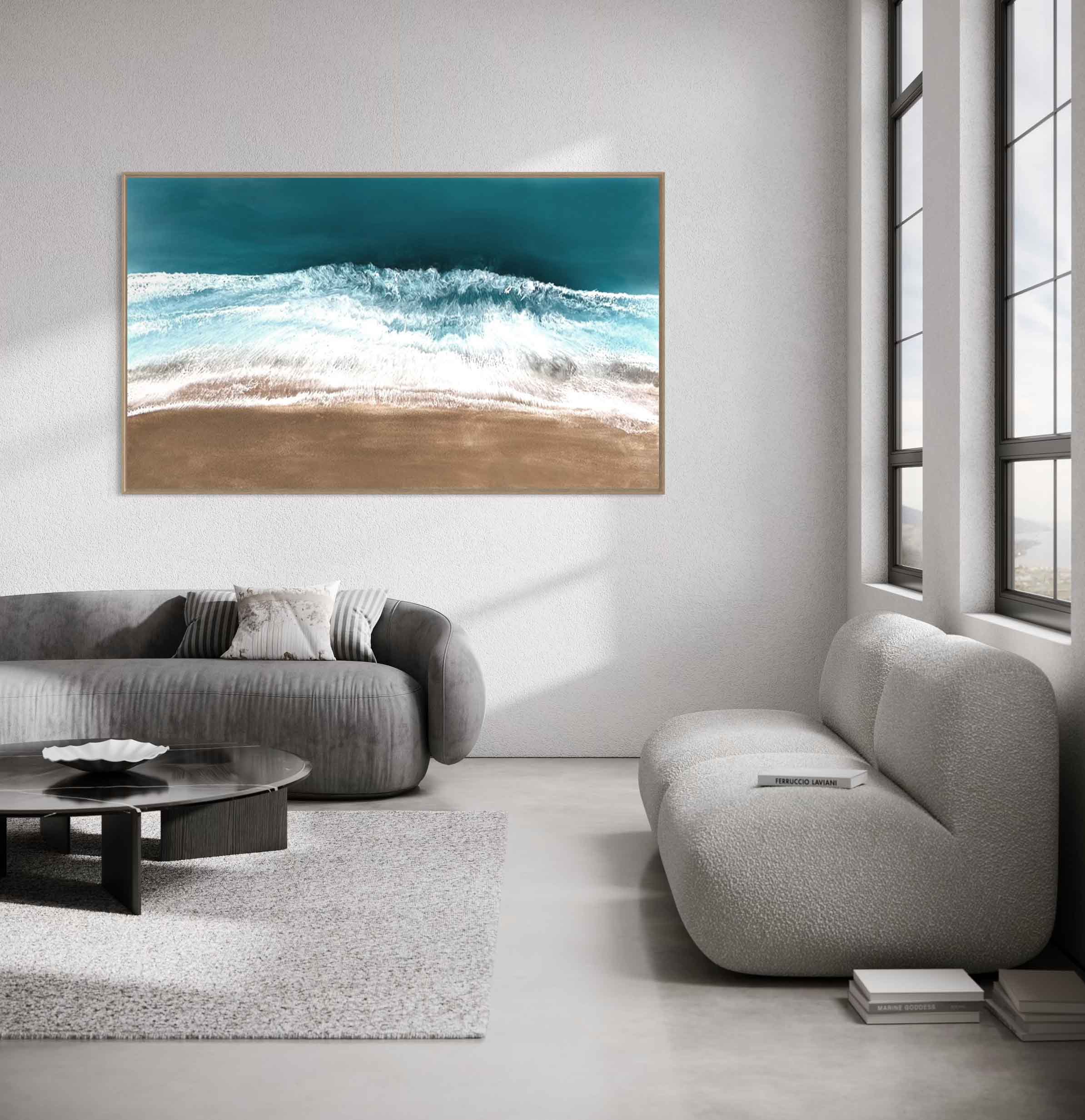 In this painting, I ventured to blend realism with a touch of surrealism, using resin and pigments to capture the mysterious depths and dynamic surface of the sea. The colors and textures create a dreamlike vision of the ocean’s power and tranquility. The artwork is meant to evoke the awe one feels when faced with the vast, untamable natural world, providing a daily reminder of nature’s dual nature of calm and chaos. The piece comes alive in any space, adding a serene yet invigorating energy to your home.