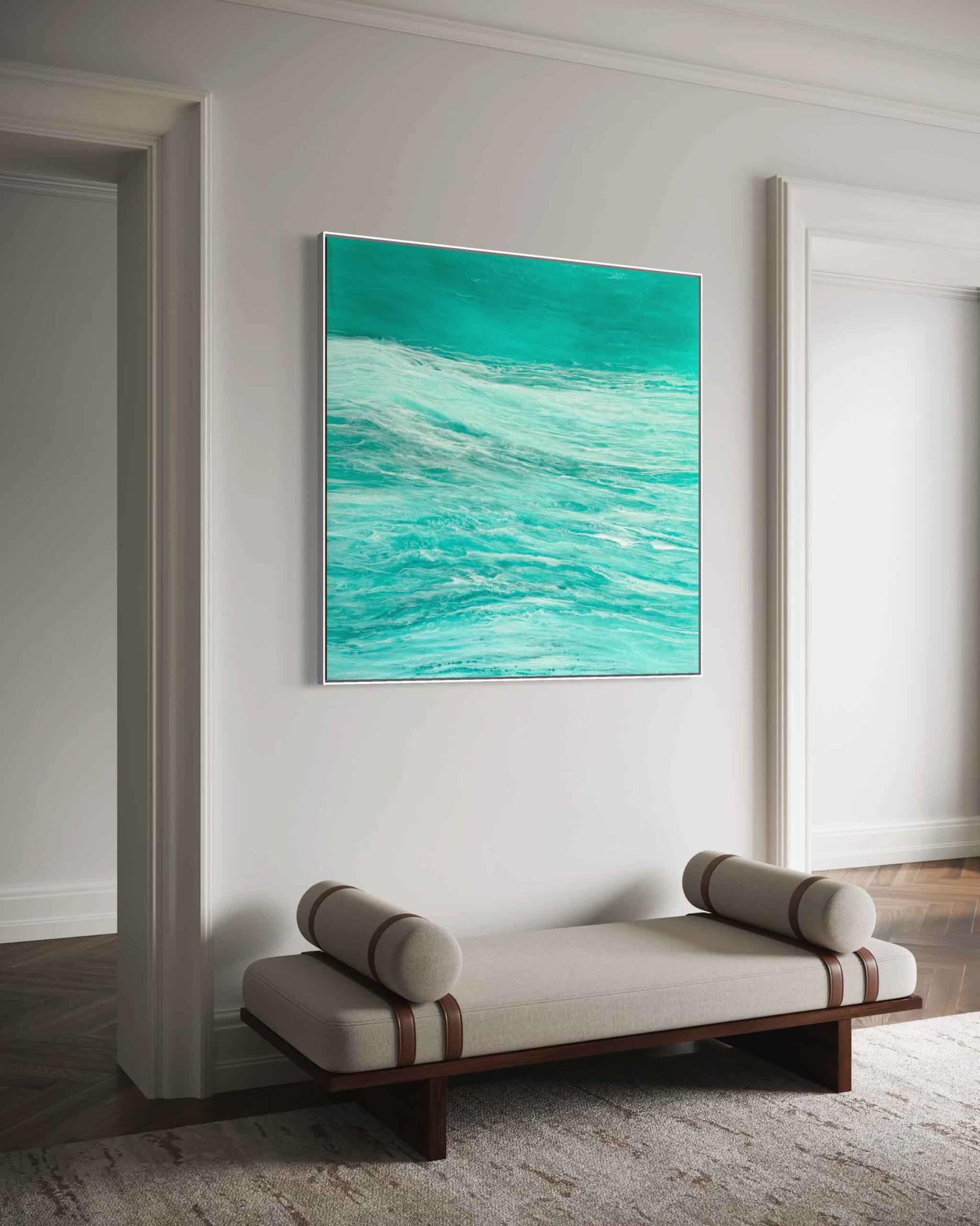 In this painting, I ventured to blend realism with a touch of surrealism, using resin and pigments to capture the mysterious depths and dynamic surface of the sea. The colors and textures create a dreamlike vision of the ocean’s power and tranquility. The artwork is meant to evoke the awe one feels when faced with the vast, untamable natural world, providing a daily reminder of nature’s dual nature of calm and chaos. The piece comes alive in any space, adding a serene yet invigorating energy to your home.