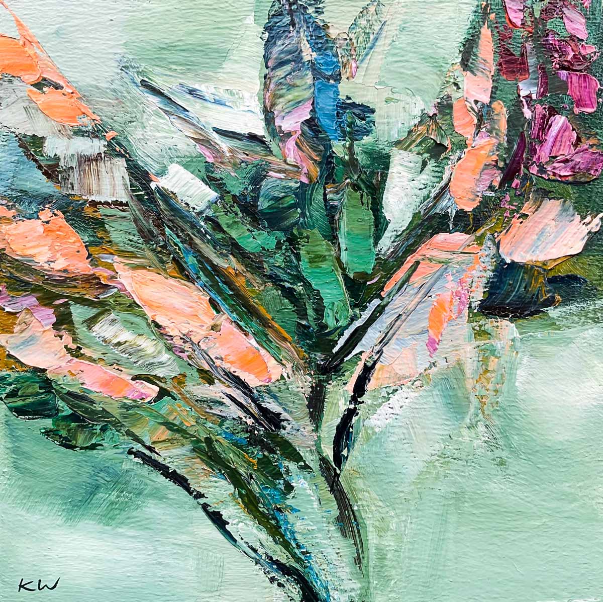 She explores form and line using texture, allowing shapes to evolve from the thick and generous application of impasto and paint. The light is reflected and emphasised from the sculptural effects created by the textured finish. The final stage of varnishing evens out the surface and increases the colour saturation of the work.