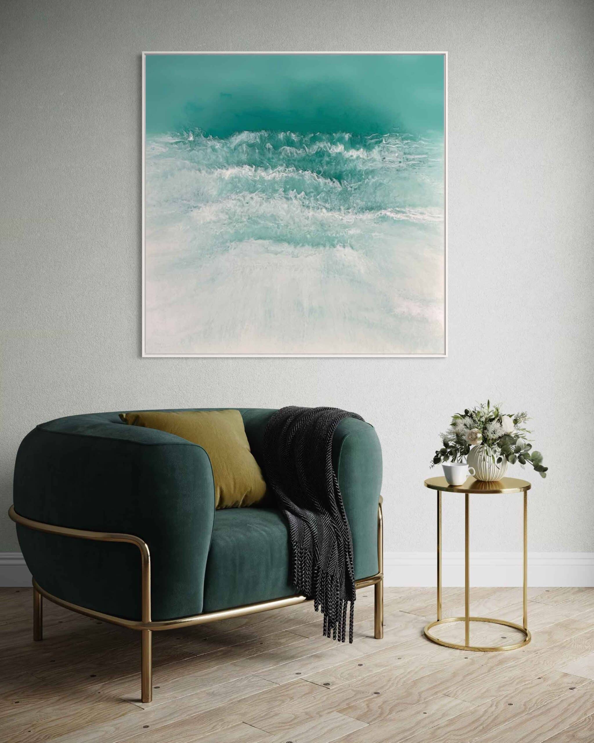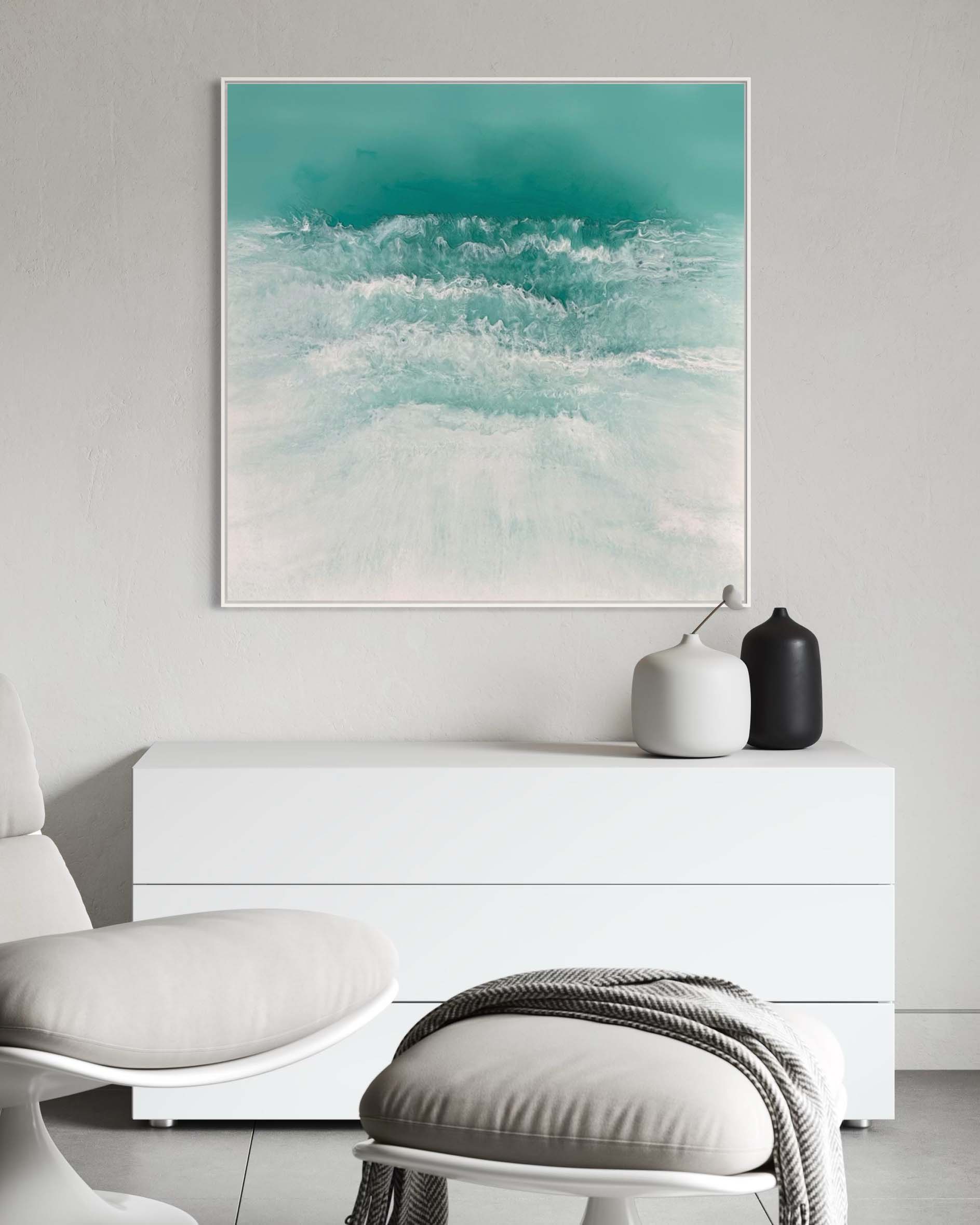 In this painting, I ventured to blend realism with a touch of surrealism, using resin and pigments to capture the mysterious depths and dynamic surface of the sea. The colors and textures create a dreamlike vision of the ocean’s power and tranquility. The artwork is meant to evoke the awe one feels when faced with the vast, untamable natural world, providing a daily reminder of nature’s dual nature of calm and chaos. The piece comes alive in any space, adding a serene yet invigorating energy to your home.