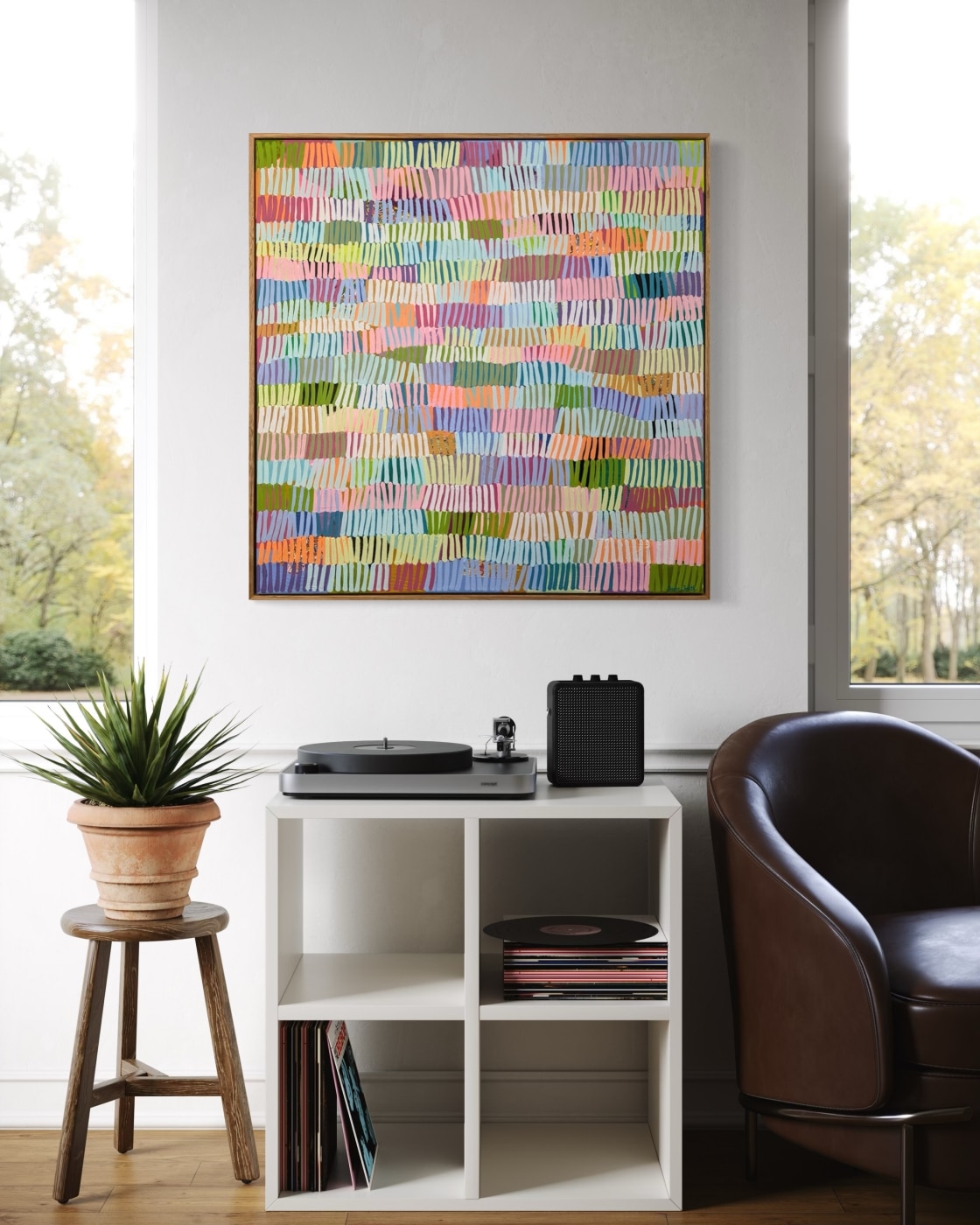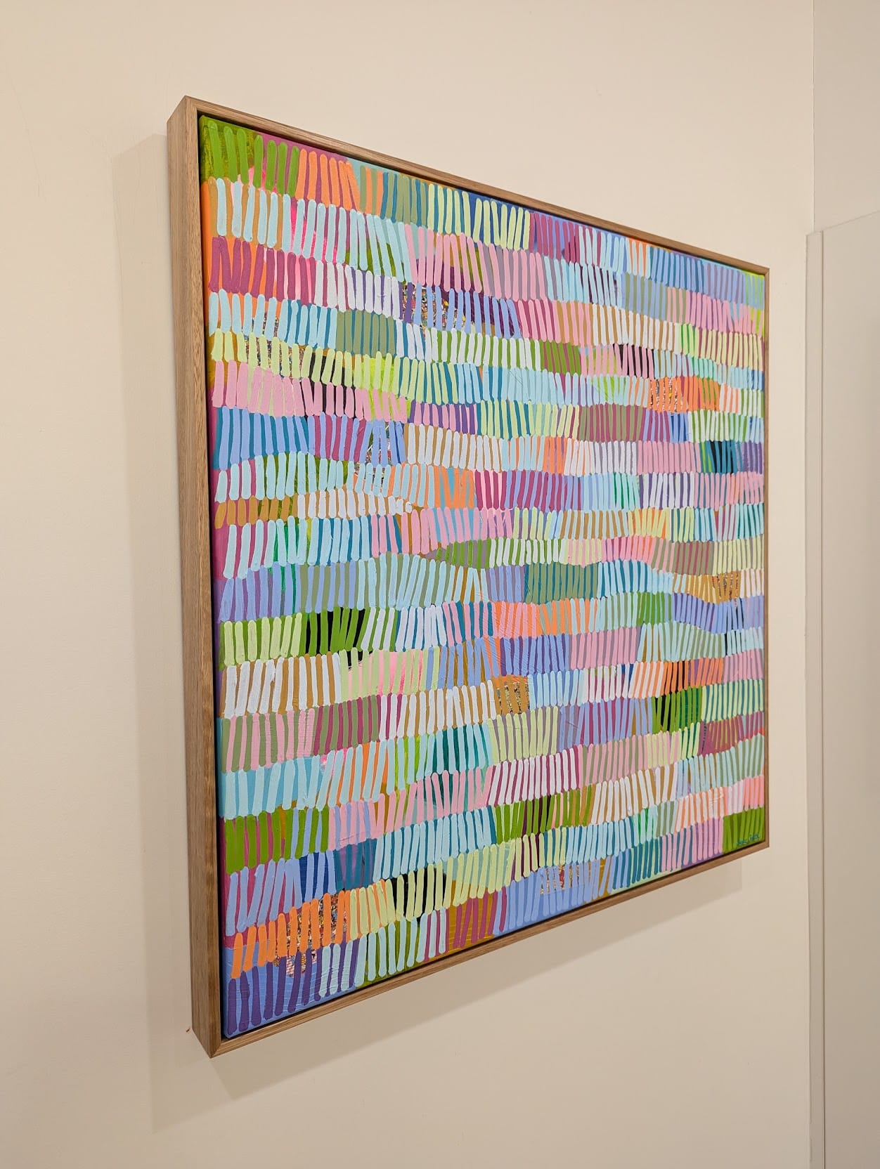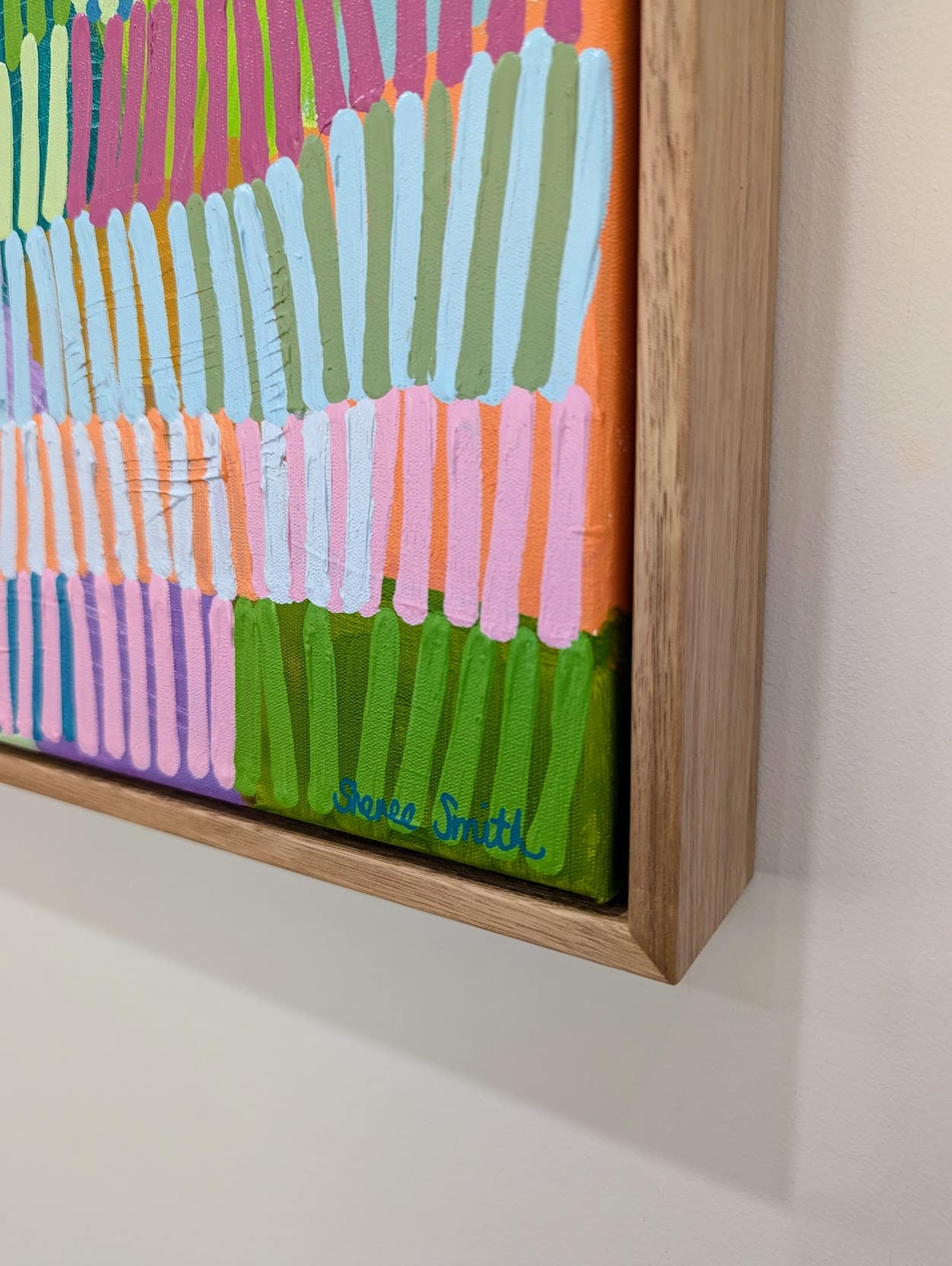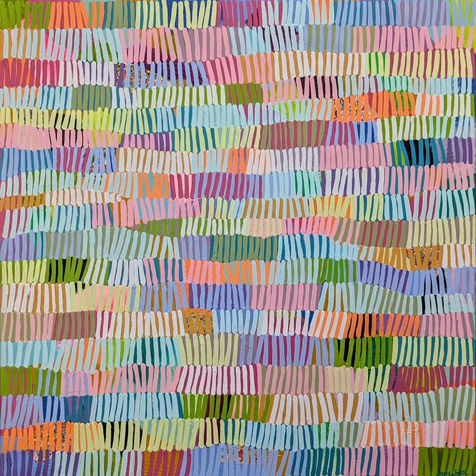 Her playful abstract works are fun, bright, and full of happiness. She enjoys working with vibrant colour palettes that bring smiles to faces and joy to the observer. Her art brightens up spaces with the power of colour and simplicity.