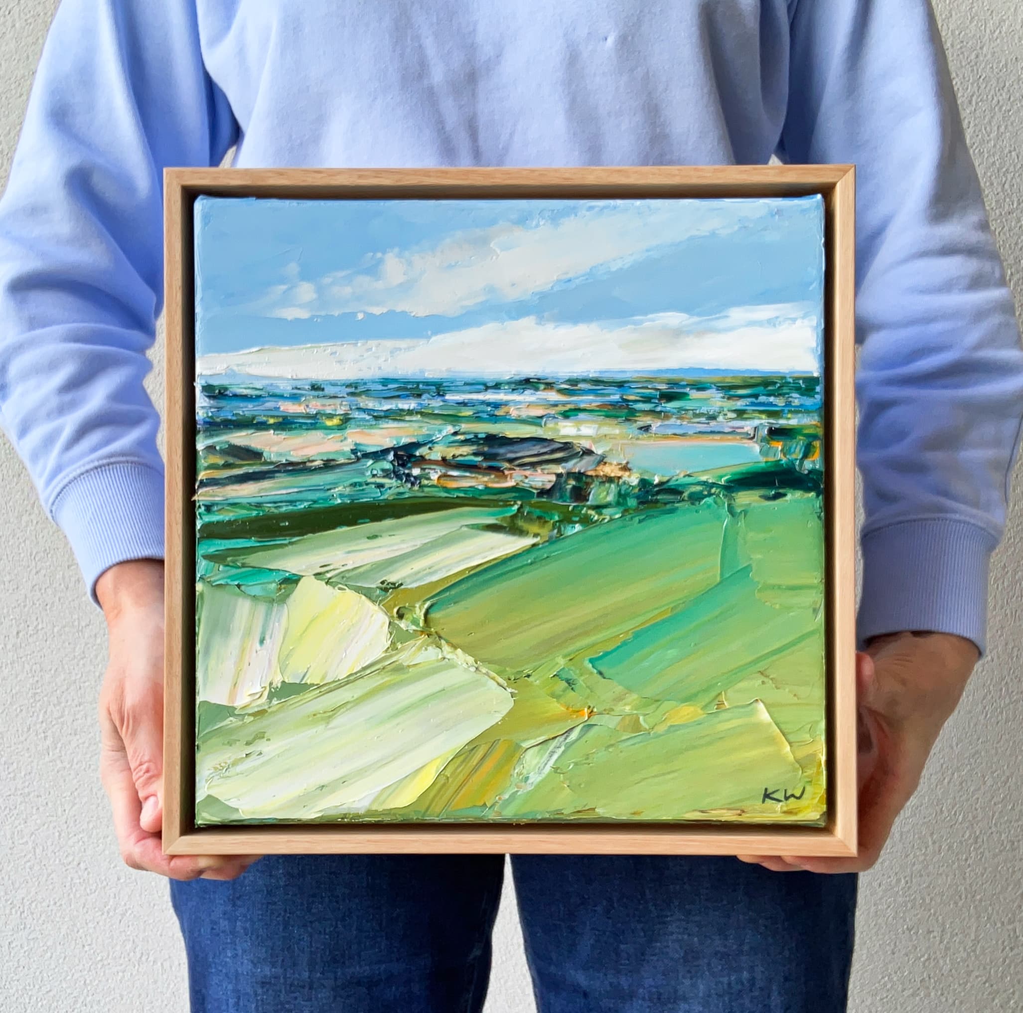 She explores form and line using texture, allowing shapes to evolve from the thick and generous application of impasto and paint. The light is reflected and emphasised from the sculptural effects created by the textured finish. The final stage of varnishing evens out the surface and increases the colour saturation of the work.